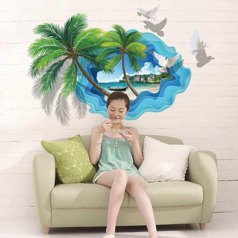 3d立体墙贴纸卧室房间床头椰树沙滩海报贴画墙面装饰墙纸自粘布。热门设计联盟服务商